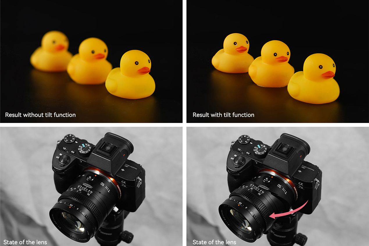 As shown in the left figure below, there is no difference between the lens and the regular 50mm f1.4 lens when the tilt function is not used. With a large aperture, only part of the ducks are in focus and the rest of the image is bokeh. As shown in the right figure below, after using the tilt function and without changing the aperture, the focal plane is parallel to the sides of the three ducks, so all three ducks can be shot clearly.
