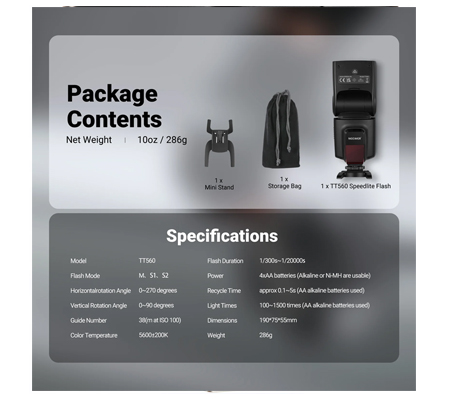 Professional Flash Output for Stable Lighting- TT560 speed light features GN38 (ISO 100) guide number with 8 manual power levels from 1/128 to 1/1, stable 5600K±200K daylight color, 0.1–5s recycle time, and 1/300 to 1/20000s flash duration. Note: Does NOT support TTL, HSS, or camera menu control. Recommended shutter speed below 1/200s