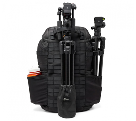 Inside the back door, you’ll find zippered transparent organization pockets on top of a CradleFit laptop pocket that fits up to a 16'' MacBook Pro. The side doors have large exterior stretch pockets that hold up to a 1L bottle and are reinforced at the bottom for tripod support. Additional loops and pockets on the top of the sides allows for quick access to items and secure tripod attachment. The backpack stands upright on its own, making it easy to handle and access your gear.