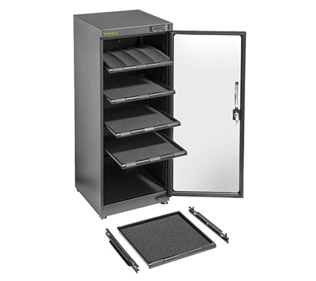 Casell Dry Cabinet, dirancang dengan kinerja tinggi dengan cepat mengontrol tingkat kelembaban, sangat efisien, hemat energi, dan tidak berpolusi. Penempatan internal elemen kontrol kelembaban melindungi komponen dari kerusakan. Pintu kaca dibuat dengan kaca tempered berkualitas tinggi, anti lembab, tahan debu dan memiliki segel kedap udara yang sangat baik dan Layar LCD menampilkan informasi yang sangat Mudah Dibaca.