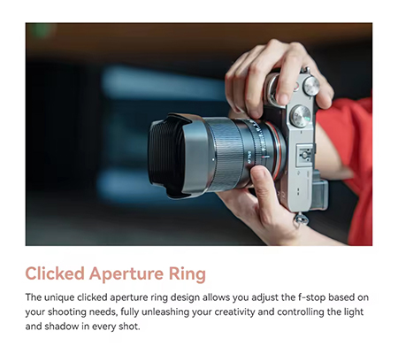 The unique clicked aperture ring design allows you adjust the f-stop based on your shooting needs, fully unleashing your creativity and controlling the light and shadow in every shot.