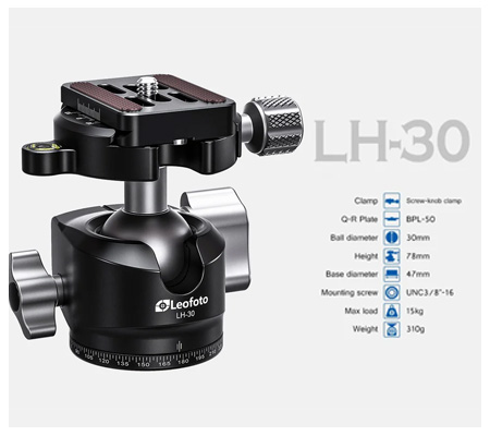 The included Leofoto LH-30 Low-Profile Ball Head is lightweight aluminum and features an Arca-type compatible quick release system. A precisely-machined ball provides ultra-smooth movements and a large, ergonomically-designed locking knob, enables the movement of the ball head to be controlled. Laser-engraved scales on the panning base provide precise control during panorama shooting and dual drop notches provide the capability for rapidly changing from horizontal to vertical orientation.Leofoto LP-284C Blue Tripod + LH-30 Ballhead: