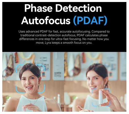 The Lyra webcam uses advanced PDAF for fast, accurate autofocusing. Compared to traditional contrast-detection autofocus, PDAF calculates phase differences in one step for ultra-fast focusing. No matter how you move, Lyra keeps a smooth focus on you.