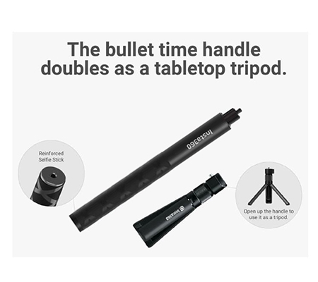 The Insta360 Bullet Time Accessory Bundle enables you to capture 360° selfies using your Insta360 ONE X action camera. The Bullet Time Handle enables you to swing your ONE X camera in a complete circle overhead without needing to reposition your hand on the grip. The handle attaches to the reinforced selfie stick which extends to a maximum length of 47.2" and features a 1/4"-20 mounting thread on the end. A folding tripod is included to mount your handle on the ground or flat surface for a level bullet-time rotation.
