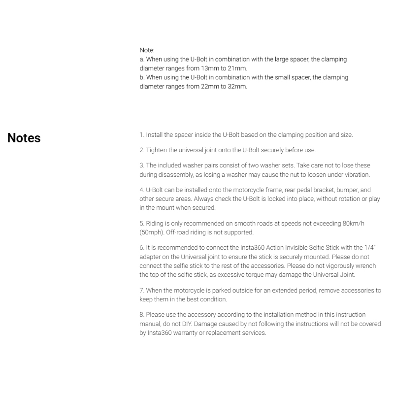 8. Please use the accessory according to the installation method in this instruction manual, do not DIY. Damage caused by not following the instructions will not be covered by Insta360 warranty or replacement services.