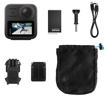 GoPro MAX Camera | 2x Stickers | Warranty | Enduro Battery 1600mAh Li-on | Curved Adhesive Mount | 2x Rubber Lens Caps | Microfiber Bag | Mounting Buckle | USB (C-C) Cable- 18in. | Long Thumbscrew