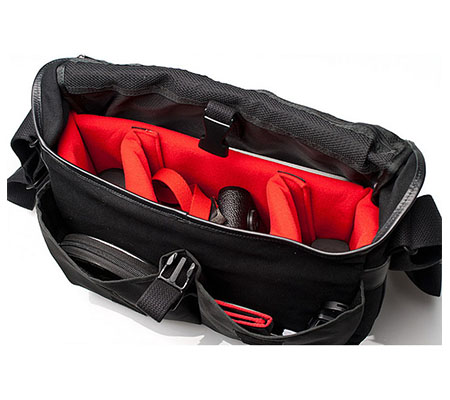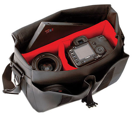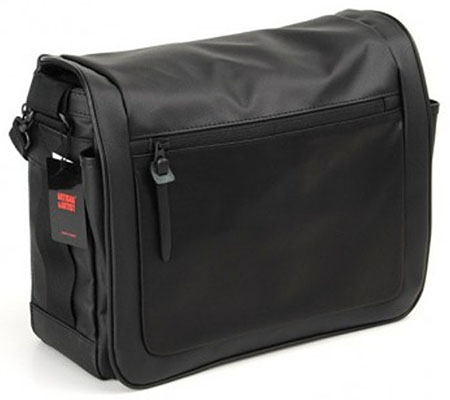 The black, messenger-style DCAM-7000 Camera Bag from Artisan & Artist which closes with a touch-tab flap and snap-buckle can accommodate a medium-sized DSLR with an attached lens as well as a second lens within a removable insert. One touch-tab divider within the insert can be adjusted to create two sections of equal or varying lengths. Without the insert, the DCAM-7000 works as a traditional messenger bag.