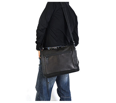 An outer zippered gusset allows the rear-facing inner wall of this bag to make room for a 13" laptop. Along the front-facing outer wall of the bag are two open pockets that can be used to hold camera or computer accessories such as lens caps or a power adapter. When the DCAM-7000 is closed, those pockets are covered by the front flap which has its own zippered pocket that can be used to hold documents, a map, or a small notebook. A rear pocket with two inner pockets can be used to keep similar items closer to the body. When more carrying space is needed, an Artisan & Artist ACAM-81S, ACAM-86, or ACAM-88 System Pouch can be connected to the side of the bag to carry and provide easy access to a compact camera, light meter, or cell phone.