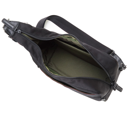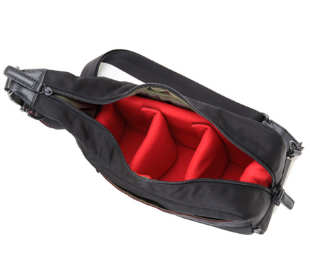 Left, right and front access to gear as well as a shoulder strap which adjusts with one finger are a few good reasons to consider the black RRN-01C Sling Bag from Artisan & Artist. The bag features a main compartment with a removable insert for storing a mirrorless camera body with an attached normal or wide angle lens, one extra lens, and a small accessory such as a flash or exposure meter. Next to the insert is a slip-in pocket for a small tablet. Two, included, padded, touch-fastening dividers create three sections for organizing gear to your liking.