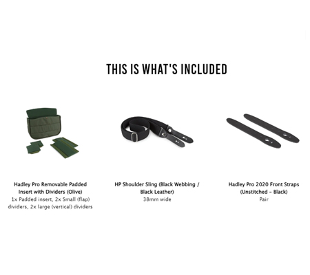 An upgraded version of our popular, Hadley Pro Camera Bag. Fits most DSLRs (without a battery grip) or almost any mirrorless camera and 2-4 small-to-medium sized lenses with accessories (inc 70-200mm lens not attached to the camera). Made in England with 3-layer waterproof fabric and real leather. REMOVABLE PADDED INSERT The flexible padded insert is made from dense, fabric covered, 'closed cell' foam and provides impact protection on all sides, including the lid. Like the bag itself it is flexible front-to-back to allow it to fit slightly bigger gear than its dimensions suggest. 2x vertical dividers and 2x horizontal flap dividers are included and can be attached anywhere inside with Velcro®. The padded insert can also be removed to turn the bag from a camera bag to a casual messenger bag in seconds. FRONT DUMP POCKETS The front dump pockets are perfect for cables, film, spare batteries and those little bits and bobs you want to keep separate, whilst providing great extra storage space. On the top-outside corner of each pocket is a pop-clip. Release this to expand the space available. Keep it closed to form a perfect place to clip pens, pencils etc. TOP HANDLE AND BACK POCKET An easy carry top handle is reinforced with fibreglass and has leather on the underside to allow you to pick up and carry the bag with comfort, without using the shoulder sling. On the back pocket the improved weatherproof zip helps protect important documents. The luggage trolley retainer strap is just below the opening to the back pocket. LUGGAGE TROLLEY STRAP The luggage trolley retainer strap lets you attach your camera bag safely to your suitcase when travelling through a busy airport or city. 'QRS' FRONT STRAPS The top-grain leather front straps have the 'Quick Release System' feature. Simply slide the straps up-and-off the brass clogballs at the top for quick and easy access. Once the leather softens and you become used to it there's a good chance you'll be able to open the bag one handed while wearing it. The buckles allow you to fine tune the 'fit' of the front pockets. You don't need to use the buckles to open the bag. REMOVABLE SHOULDER SLING The Hadley Pro 2020 features a shoulder sling that can be adjusted longer or shorter to suit your height and shooting style. It can also be completely and easily removed in seconds if you would prefer to carry the bag using only its top handle. It is made from shuttle woven polyester and top-grain leather with solid brass fixings. SCULPTED TOP FLAP The sculpted top flap helps prevent rain or snow getting into the main compartment. It is made of the same 3-layer waterproof fabric as the rest of the bag. DISCRETE AND SLIM The discrete styling of the Hadley Pro 2020 means that it doesn't look like a camera bag, which is ideal for travelling without drawing attention. The bag is naturally flexible and moulds to the body of the wearer. Its slim body makes it a great bag to weave through crowds with. ATTACH END POCKETS FOR EXTRA STORAGE AVEA 7 and AVEA 8 pockets can clip onto the strong leather side panels at either end of the bag. These can add storage or help with organisation to keep everything easily accessible when you need it. Shown in photo with an AVEA 8 pocket (and optional SP40 shoulder pad). HADLEY SMALL PRO VS HADLEY PRO 2020 The Hadley Pro 2020 is simply a bigger version of the Hadley Small Pro, sharing exactly the same features. The Hadley Small Pro is compatible with AVEA 7 End Pockets. The Hadley Pro 2020 is compatible with AVEA 7 and AVEA 8 end pockets. An example of the difference in size between the two camera bags; the Hadley Small Pro is capable of carrying a Canon 5D with a small to medium lens attached, plus a second column with two small lenses stacked on top of each other. The extra height and width of the Hadley Pro 2020 would let you have a third column where you could carry a 70-200mm lens as well.