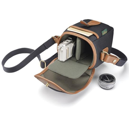 Stylishly store, transport, and protect your small rangefinder, mirrorless, or other small camera, lens, and related accessories with the black canvas/tan leather Billingham 72 Camera Bag. This attractive bag features a front dump pocket for small stuff, top grain leather accents, foam padding, solid brass hardware, and clog-bolt closure. Carry this lightweight 16.2 oz bag with the removable, adjustable shoulder strap or wear with the rear belt loop. Included with the bag are a vertical divider, removable padded base, and a drawstring storage bag.