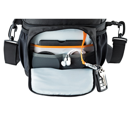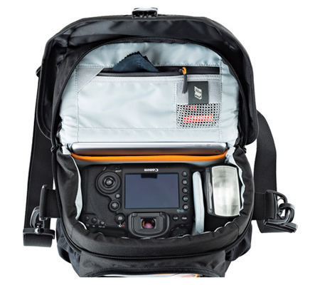 Store, transport, and protect your DSLR with 24-105mm attached lens, 1-2 additional lenses, flash and related accessories with the black Nova 170 AW II Camera Bag from Lowepro. The bag features a zip pocket under lid, dual side stretch pockets, and an exterior front zip pocket with organizer and key fob. There's also a handy rear zip pocket for flat items. The padded interior has a matching touch-fastening divider. Carry the bag with the top handle or wear it with the removable, padded shoulder strap. Photographers will appreciate the built-in weather cover.