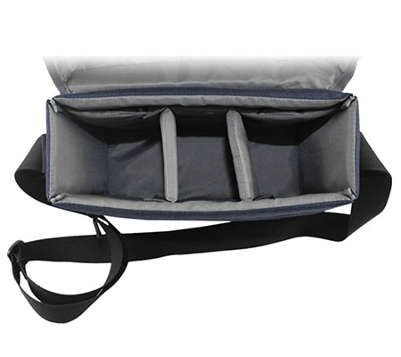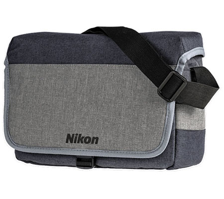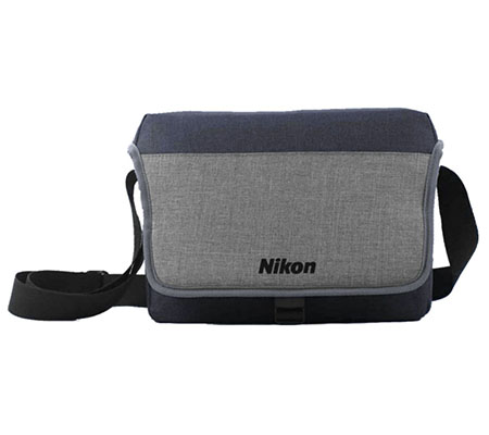 The DSLR Canvas Style Bag is a small camera bag designed to hold a DSLR and accessories, featuring removable dividers that allow you to configure the bag to your needs. The bag is grey and black in color. Additional pockets, a latch closure on the front and shoulder strap with the Nikon logo printed on it round out the features of the bag.