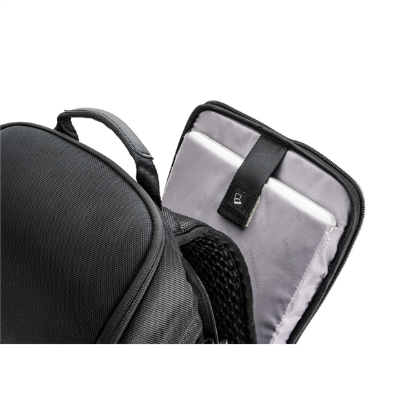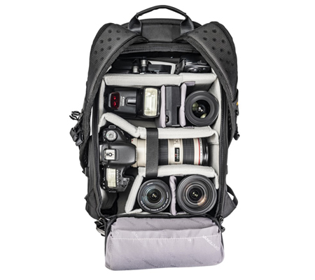 • Store, transport, and protect a mirrorless camera, four lenses, a flash, and related accessories with the VEO Select 46 Backpack in green from Vanguard. The pack has multiple pockets and padded touch-fastening interior dividers. It accommodates a 13" laptop and has a light-colored interior. Photographers will appreciate the slim roll top, double-buckle, and zippered closure. It comes with a full rain cover and can be carried with the top handles or padded harness.