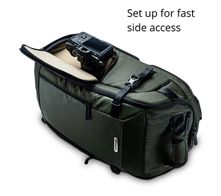 This backpack can be set up to take advantage of the multiple access points. Full access to camera and lenses is through the front of the backpack, with security straps that double up to allow you just to access the daypack section, rather than opening the full backpack. Alternatively removing the daypack base and you can set it up for fast, top access to your camera, or there is fast side access to your camera.