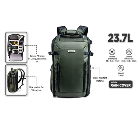 To protect your valuable kit from the lumps and bumps of real life, this backpack is well padded, and to protect your kit from the damp it is manufactured with water resistant material, but also includes a seam sealed rain cover.