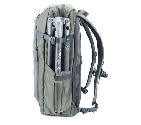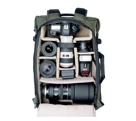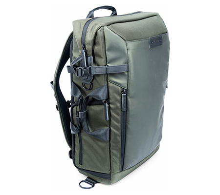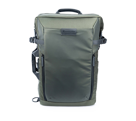 Store, transport, and protect two DSLR cameras, six lenses, a flash, and related accessories with the VEO Select 49 Backpack in green from Vanguard. The pack has multiple pockets and padded touch-fastening interior dividers. It accommodates a 15" laptop and has a light-colored interior. Photographers will appreciate the slim roll top, double-buckle, and zippered closure. It comes with a full rain cover and can be carried with the top handles or padded harness.