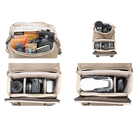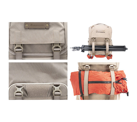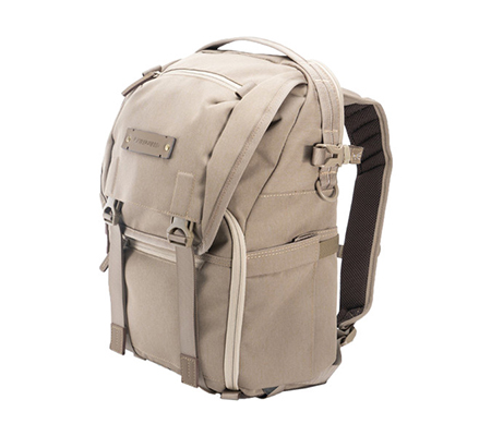 Store, transport, and protect your mirrorless camera, 3-4 lenses, a flash, and related accessories with the VEO RANGE 41M Medium Daypack Camera Backpack in beige tan from Vanguard. The pack features an inner padded sleeve for a 13" laptop/tablet, padded interior touch-fastening dividers, and multiple storage pockets. Photographers will appreciate the tripod/accessory straps on the front, and the tripod/accessory pocket with strap on the side. Carry the pack with the top handle or wear it with the padded shoulder straps, sternum strap, and padded back panel. A full rain cover is included.