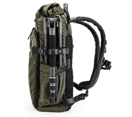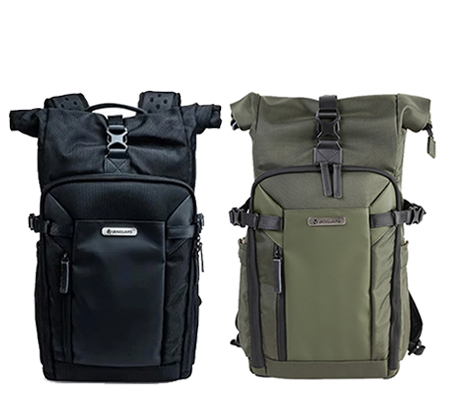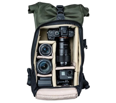 Store, transport, and protect a mirrorless camera, four lenses, a flash, and related accessories with the green VEO Select 39BRM Backpack from Vanguard. The pack has multiple pockets and padded touch-fastening interior dividers. It accommodates a 9.7" tablet and has a light-colored interior. Photographers will appreciate the rolltop/double-buckle and zippered closure. It comes with a full rain cover and can be carried with the top handles or padded harness.