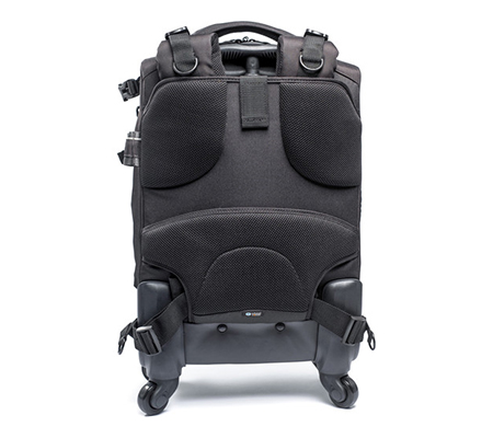 Carry your 55T Roller Bag with the top handle, left side handle, or telescoping bottom handle. Use the retractable handle with built-in wheels for travel over flat surfaces. A pair of front and rear wheels allow the bag to balance in an upright position. Secure a tripod or other objects to the bag with the dedicated adjustable straps. Included with the bag is a total coverage rain cover.
