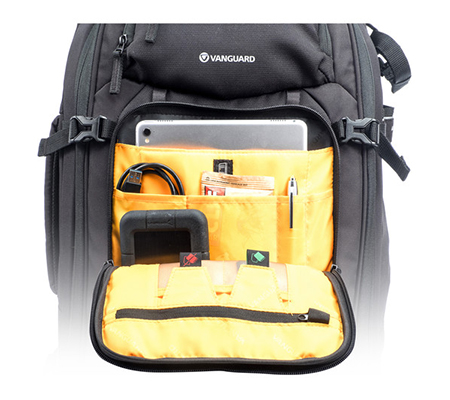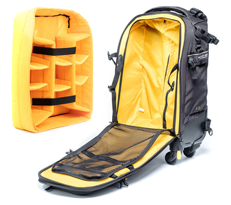 Transport, store, and protect two pro DSLRs, five lenses, a flash, and related accessories in the black Alta Fly 55T Roller Bag from Vanguard. This versatile bag has a removable insert with touch-fastening dividers for conversion to general use, and specialized dividers and straps for accommodating select drones. On the underside of the lid is a zippered pocket for a laptop up to 14", and clear-mesh accessory pockets. For your iPad/tablet and smaller items there's a zippered compartment with an organizer panel on the front exterior of the bag.
