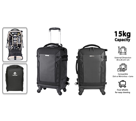 Thanks to the VEO Select 58T’s disguised “luggage” style, no one will ever guess that you're carrying all your camera equipment. Inside this well-padded “small suitcase” is a spacious internal compartment with a multitude of versatile dividers that can be adjusted to fit 2-3 gripped DSLR with attached lenses, 2-4 extra lenses (up to 400mm f/2.8), 2 flash units, accessories (memory cards, cables, battery, charger),