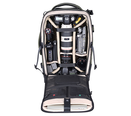 The VEO SELECT 58T is an incognito roller backpack that offers ample gear space and an array of carrying and configuration options. It will pack 2-3 gripped DSLR with attached lenses, 2-4 extra lenses (up to 400mm f/2.8), 2 flash units, accessories (memory cards, cables, battery, charger), 16" laptop and 9.7" tablet, tripod, phone, wallet, and passport.