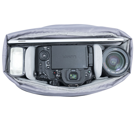 Store, transport, and protect your mirrorless camera, three lenses, and related accessories in the black VEO Flex 25M Shoulder Bag from Vanguard. The bag has multiple pockets and padded touch-fastening interior dividers. It has space to store a 7" tablet. Photographers will appreciate the light-colored interior, slim roll top double-buckle zipper closure, and included full rain cover. Carry the bag with the top handle or shoulder strap.