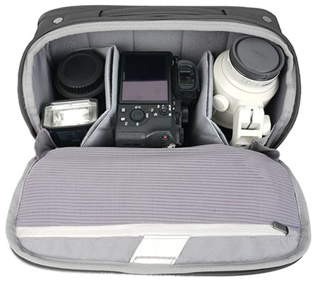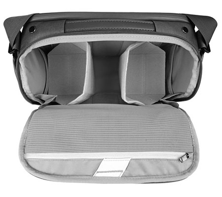 The camera compartment is 250-290mm wide, by 185-215mm tall and 120mm deep. This allows you to carry a full frame camera with up to 2 lenses (up to 24-70mm f2.8), or a DJI Mavic Air kit, separated by slimline EVA dividers that are designed to maximise the space available while protecting your kit. These dividers can be adjusted to your preferred layout, or removed altogether to create an everyday shoulder bag. Full access to the camera compartment is through the top of the bag which opens away from the body for maximum security.