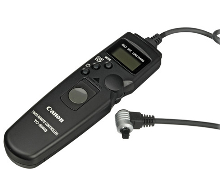 The Canon TC-80N3 Timer Remote Control is a remote switch with a 2.6' (80cm) cord and a self-timer, interval timer, long-exposure timer, and exposure-count setting feature. The timer can be set anywhere from 1 second to 99 hours, 59 minutes, or 59 seconds. A dial enables you to easily enter the numeric settings with a single thumb. The LCD panel can also be illuminated. The rear of the controller has a hole to keep the EOS-3's remote control socket cap.