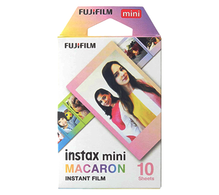This single pack of Fujifilm instax mini Macaron Instant Film contains 10 sheets of instant color film that is compatible for use with the Fujifilm instax mini series of cameras. This film features vivid color reproduction with natural skin tones when used under daylight (5500K) or electronic flash lighting conditions. A refined grain structure provides high image sharpness and clarity as well as a versatile ISO 800 film speed for use with a wide variety of subjects. Each sheet of film produces a 2.4 x 1.8" glossy image area that is surrounded by a pastel-colored, dessert-themed border. Quick, instant developing is possible when working in temperatures between 41-104°F.