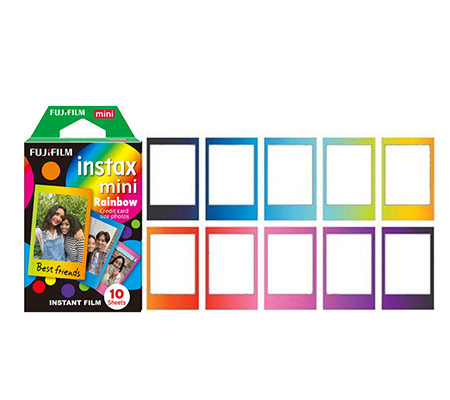 This single pack of Fujifilm instax mini Rainbow Instant Film contains 10 sheets of instant color film that is compatible for use with the Fujifilm instax mini series of cameras. This film features vivid color reproduction with natural skin tones when used under daylight (5500K) or electronic flash lighting conditions. A refined grain structure provides high image sharpness and clarity as well as a versatile ISO 800 film speed for use with a wide variety of subjects. Each sheet of film produces a 2.4 x 1.8" glossy image area that is surrounded by a colorful rainbow patterned border. Quick, instant developing is possible when working in temperatures between 41-104°F.