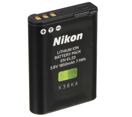 The Nikon EN-EL23 Rechargeable Lithium-Ion Battery is a 3.8V rechargeable battery with a 1850mAh capacity designed for use with the COOLPIX P600 digital camera. It can be charged with the MH-67P battery charger.