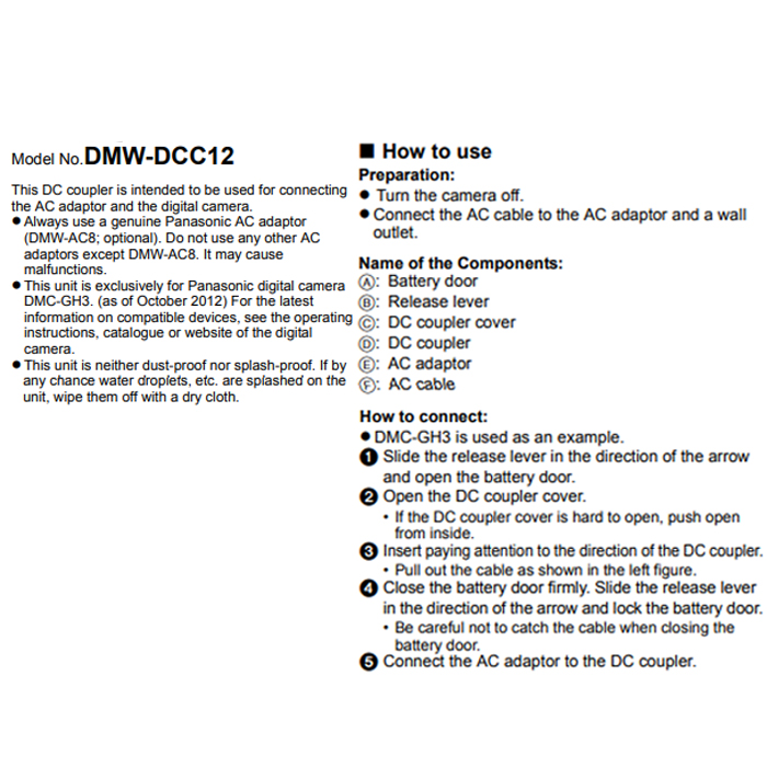 The DMW-DCC12 DC Coupler from Panasonic is used with the required, user-supplied DMW-AC8 or DMW-AC10 AC Adapter to enable you to power a compatible Lumix digital camera directly from an AC outlet. This setup conserves battery life and allows for long-term, continuous shooting.