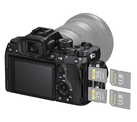 • Dual memory card slots both accept either CFexpress Type A or SD-type memory cards. The dual slot design allows for flexible file saving and handling and can be configured to partition file types or can be used for overflow recording. Additionally, both of the card slots are rated to support UHS-II memory cards for faster transfer speeds.