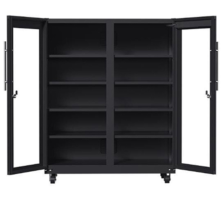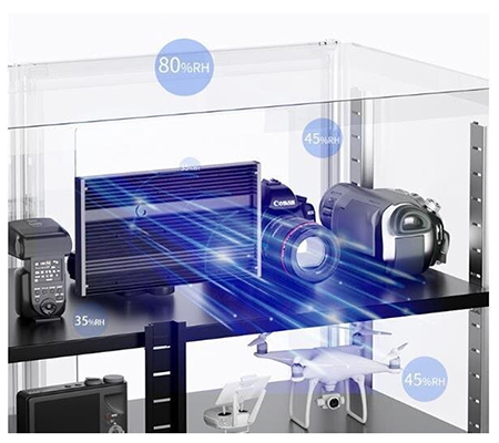 Dengan teknologi pengeringan listrik terbaru, kabinet ini menjaga kelembaban di dalamnya pada tingkat yang optimal untuk mencegah pembentukan jamur, korosi, dan kerusakan lainnya akibat kelembaban. Anda dapat dengan mudah mengatur dan memantau tingkat kelembaban dan suhu melalui panel kontrol digital yang intuitif yang terletak di bagian depan kabinet.