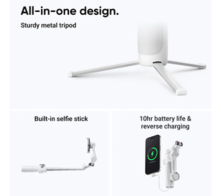 A selfie stick, tripod, and power bank, all folded into one compact tool. With 10 hours of battery life, capture from dawn to dusk seamlessly.