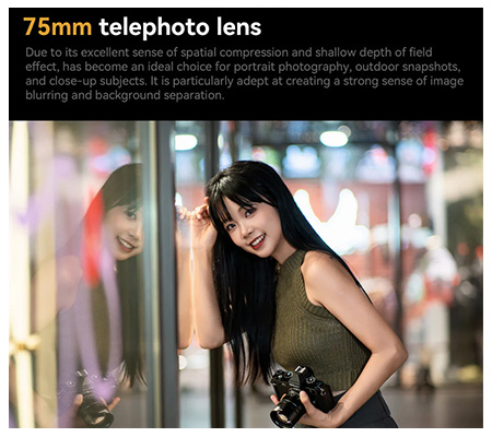 Smoother bokeh than 50mm and more flexible framing than 85mm. Unlike 85mm lenses that require over 5-8 meters for full or half-body shots, the 75mm works perfectly within 3-5 meters, making it ideal for indoor portraits and still life. It also delivers creamier bokeh than a 50mm, with a natural intimacy that follows wherever inspiration leads.