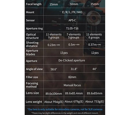 - Gambar Berkualitas Tinggi berkat Apertur maksimum Bright T1.05 sangat cocok untuk situasi cahaya rendah dan memberikan kedalaman bidang yang dangkal untuk tampilan yang lebih sinematik.
