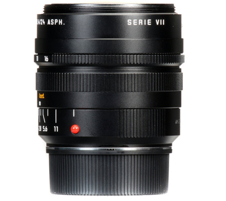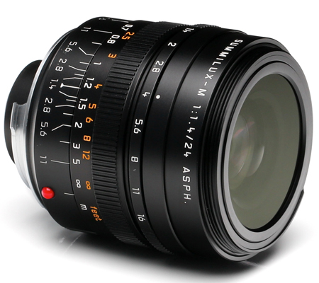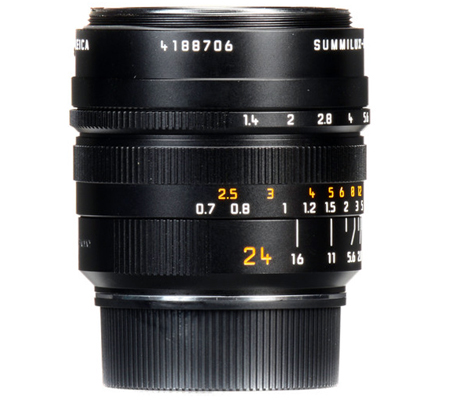 Blending a versatile wide-angle focal length with a sophisticated optical design, the Summilux-M 24mm f/1.4 ASPH. from Leica is a fast prime designed for M-mount rangefinder cameras. Characterized by its bright f/1.4 maximum aperture, this lens also incorporates a series of anomalous partial dispersion glass elements, and one aspherical element, that help to control color fringing and various aberrations for improved clarity and sharpness. A floating elements system is also used for maintained image quality throughout the focusing range, from 2.3' to infinity.