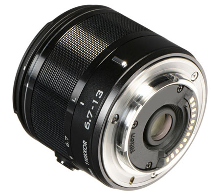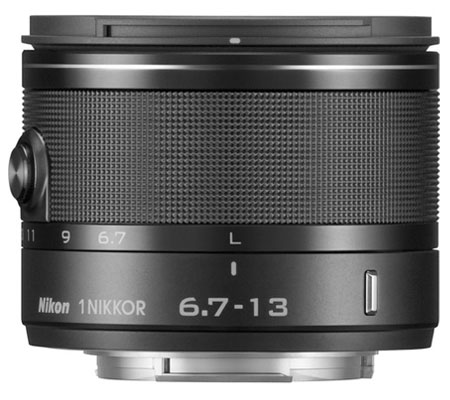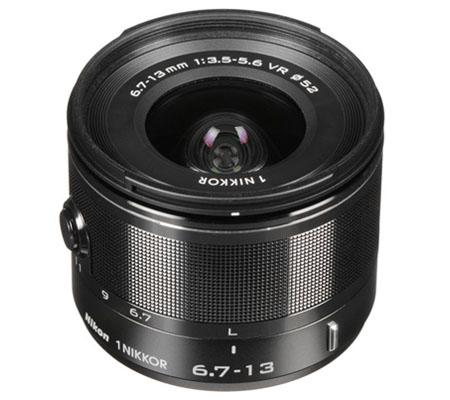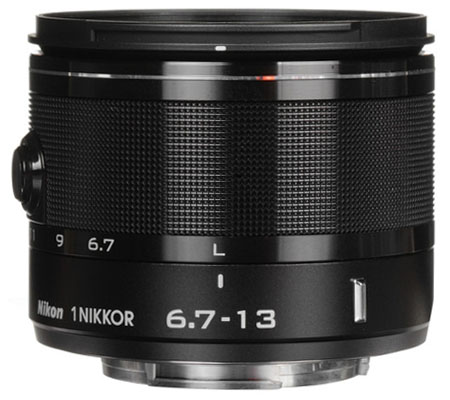 The silver 1 NIKKOR 6.7-13mm f/3.5-5.6 VR Lens from Nikon is a compact wide-angle zoom lens compatible with all Nikon 1 cameras equipped with the Nikon 1 mount. Its 6.7-13mm focal length is equivalent to 18-35mm in 35mm format, covering a range from a super-wide angle for landscapes and close group shots to an angle close to what you see with your eyes. This wide lens provides a 100° angle of view to bring more into the frame, as well as foreground-subject emphasis.