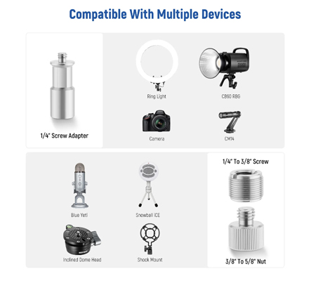 Multiple Adapters Included- The stand also comes with a 1/4” screw adapter, a 1/4” to 3/8” screw adapter, and a 3/8” to 5/8” screw adapter for a ring light, phone holder, camera, webcam, projector, and microphone used for various applications. 4 cables straps are included for neat cable organization