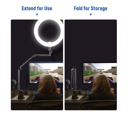Flexible Articulating Stand- Single arm length: 12.6" (320mm), fully extended length: 35.4" (900mm). The stand can be folded into 13.8" (350mm) for space-saving storage. The top and bottom of the stand are 360° rotatable. They can be angled and locked by using the knobs for flexible and effortless adjustment