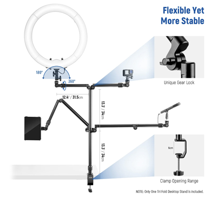 Heavy Duty Desktop Camera Mount- Made of black anodized aluminum alloy, this articulating table stand is incredibly rigid. 1" (25mm) in diameter, this stand features a load capacity of 10lb/5kg, which is 3 times higher than its counterparts. Joints are firmly locked by gear to make sure your camera, ring light, and other devices are securely stabilized during use