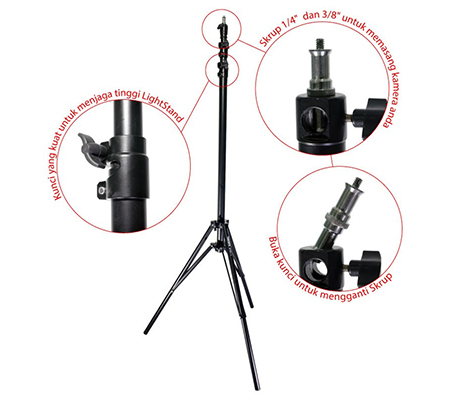 Light stand yang berfungsi untuk menopang perlengkapan lighting atau pencahayaan anda, memudahkan anda untuk mengatur cahaya dalam proses pemotretan indoor maupun outdoor, bisa dipasangkan payung atau softbox untuk mendapatkan efek cahaya yang diinginkan.