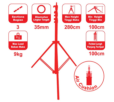 Untuk tipe SPIRIT-3 ini sudah dilengkapi dengan Air Cushion, yaitu bantalan angin yang berfungsi untuk meredam benturan jika ada section bagian atas yang jatuh ke bawah ketika kunciannya kita longgarkan. Fungsi ini berguna untuk melindungi lampu atau peralatan yang kita pasang di atas Light Stand ini supaya tidak terguncang parah sehingga menyebabkan kerusakan.
