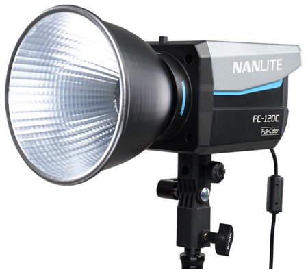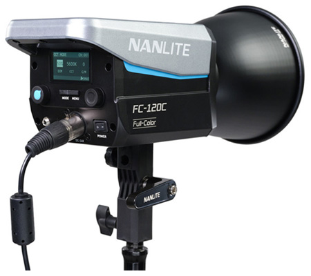 The Nanlite FC-120C is a surprisingly compact and lightweight LED spotlight that provides full RGB color and a wide CCT range of 2700K–7500K, and even though it's small and light, it cranks out 12850 lux, 1193 fc @1M 5600K with included reflector. FC-120C runs on batteries, powerbanks, or AC and delivers highly accurate light and a versatile array of control methods: onboard, Bluetooth, 2.4G, and DMX/RDM. Creators always want their lights to be as bright as possible while still being small and easy to hide behind in-frame objects, and also be affordable. The FC-120C fills this role perfectly. It's easy to use for complete beginners and also provides advanced features. A latching hard-foam case is included that holds the FC-120C, AC power adapter, 45° reflector, and Bowens-Mount adapter. It's covered by a 2-year warranty that extends to 3 years with online registration, and it's stocked, supported, and serviced by our responsive team in the USA.
