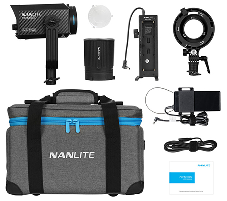 A Bowens-mount adapter with an umbrella holder is included with the Forza 60C RGBLAC for nearly unlimited light-shaping options. A battery handgrip is also included, which has plates for 2 NP-F batteries, an LED battery-life meter, and a stand mount. All the included items fit perfectly into the padded case, so you will have them at every shoot.