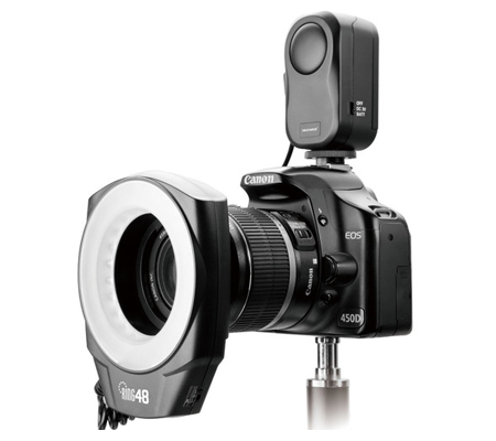 Powering the RING48 is simple with two options available: either 2 AA batteries or the 3 VDC power input. An AC charger is included for continuous power, though when it is powered by batteries it will run for about 1.5 hours. Additionally, it mounts directly to most lenses and comes with 49, 52, 55, 62, and 67mm adapter rings.