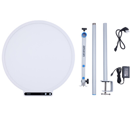 Built for desktop creators in home studios or office applications, the charcoal-finish Verge Max Bi-Color Round LED Light Panel from amaran has a wide circular surface to provide bright, soft, and even illumination. Thanks to its round form and edge-lit technology, it can be used to create a flattering softbox-like look, while its output makes it useful for creative setups in need of a bright, yet thin fixture. The Verge Max is part of the brand's first LED series designed for desktop creators and is ideal for those who desire warm-to-cool white color without giving up comfort for the eyes during long recording sessions. The Max version is optimized with front-facing controls and app compatibility, plus a convenient desk clamp stand for overhead or low-angle lighting. It suits live-streaming setups, video recording, product work, and other kinds of content creation. The included desk stand clamps directly onto your desk, while providing easy light positioning. The ultrathin body of the Verge Max with a charcoal finish will complement your workspace decor and ensure complete silence and flicker-free operation. Whether placed at your desk, near walls, or in a corner, its space-saving design won't compromise high brightness and quality of light.